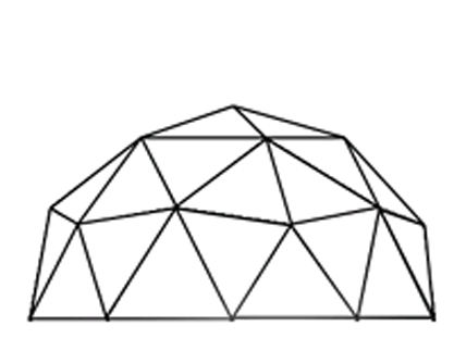 Wir haben verschiedene Kuppel auf Lager. Der kleinste ist eine 2V (zweite Frequenz = die höhe Auflösung der Dreiecke, siehe unten das Bild) Kuppel mit 5,5 m Durchmesser mit 20 m² Grundfläche.